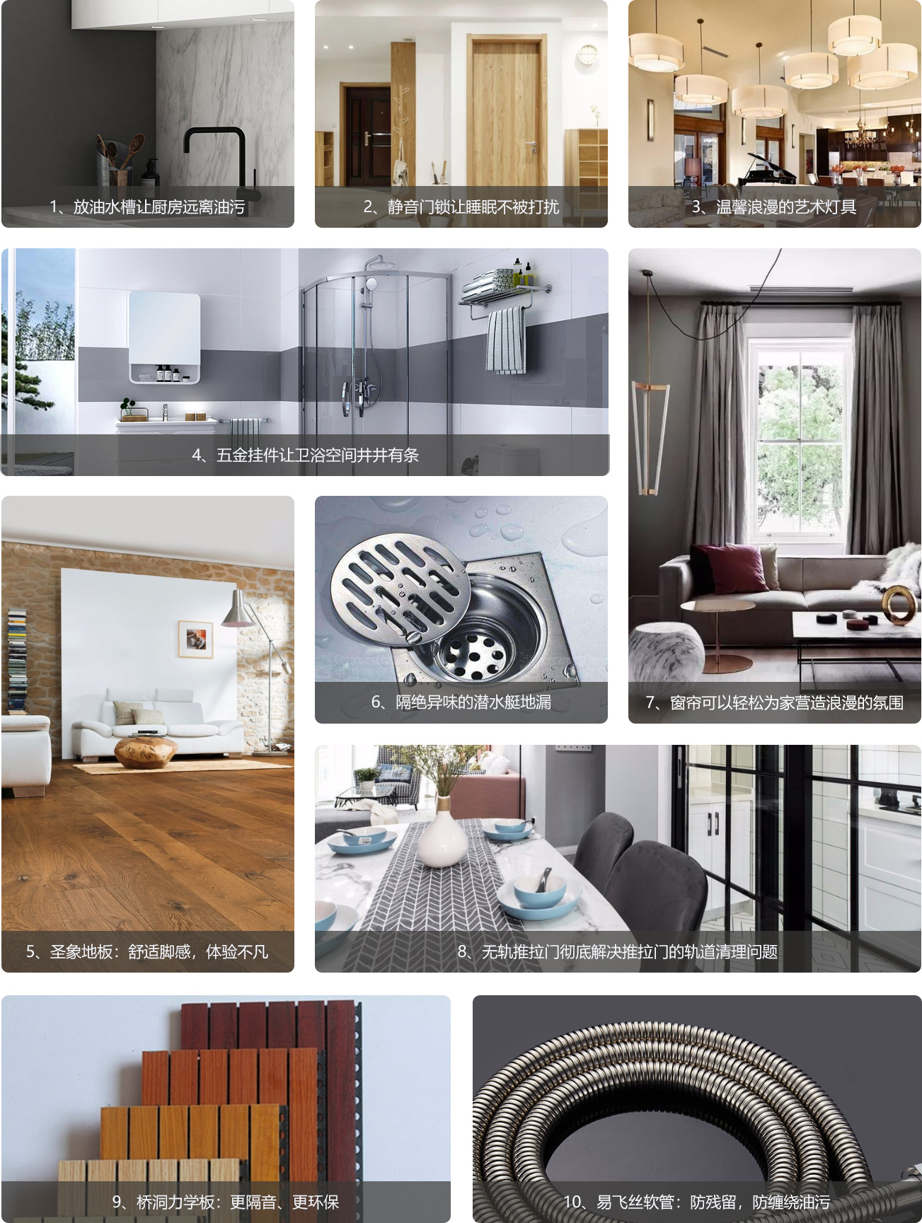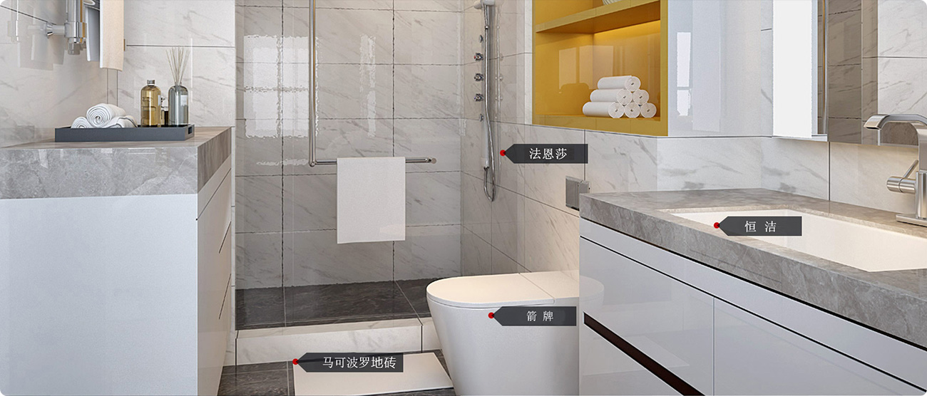 衛(wèi)生間:地面防塵施工、零污染防水系統(tǒng)施工、墻面磚、配套地磚、過門石、鋁扣板吊頂&邊線、浴霸四合一、鐵鎂合金/實木復合烤漆平開門、門鎖五金(合頁門吸)、浴室柜、配套鏡面&軟管、水龍頭、雙頭大花灑、座便器、配套軟管&角閥、衛(wèi)浴小五金、不銹鋼地漏。